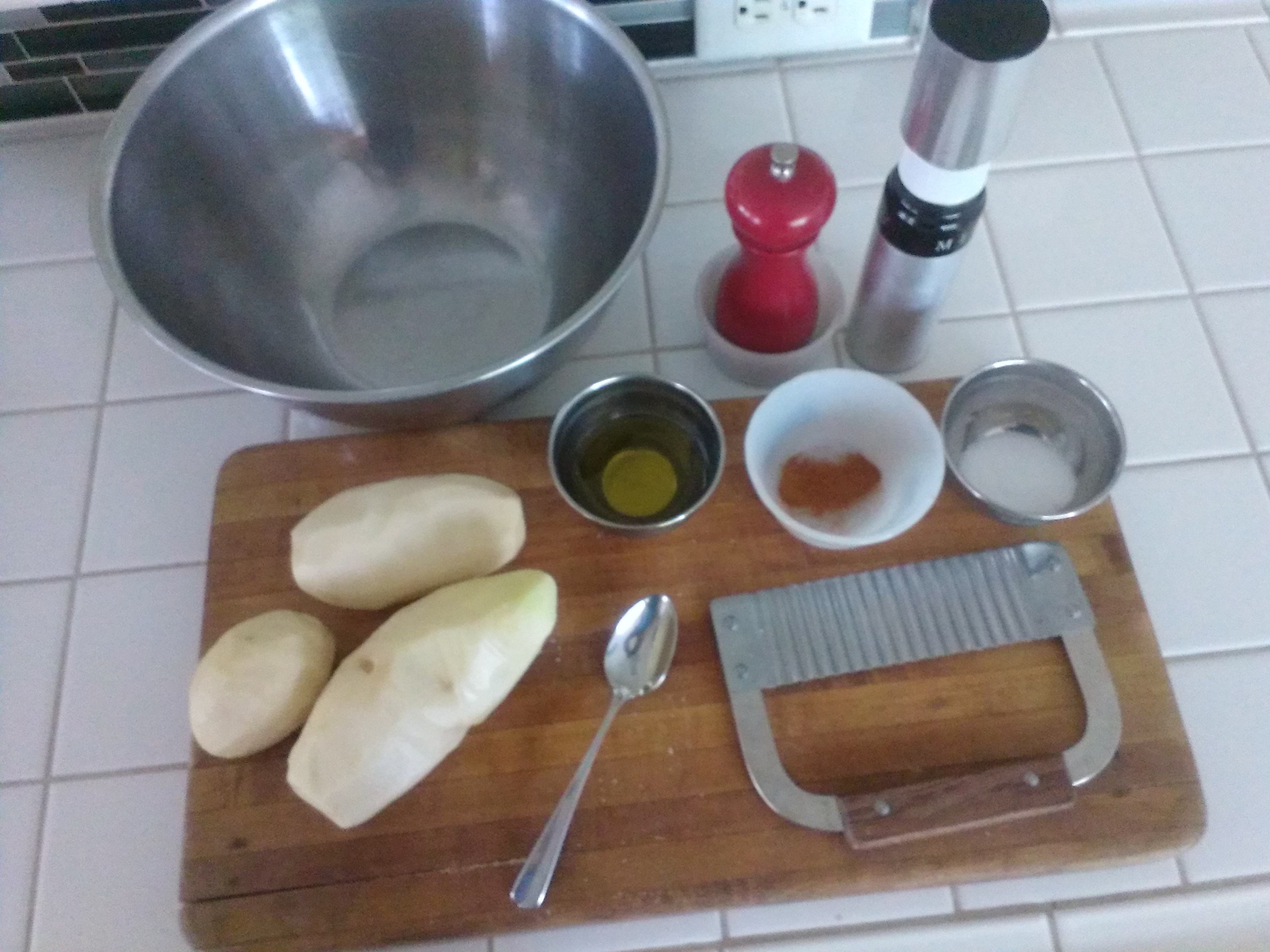 3 Russet Potatoes. 3 Tablespoons Olive Oil. 1 Tablespoon Salt. 1 Pinch of Cayenne Pepper. Note: Always Remove Sprouts From Potatoes Before Use, They Are Very Toxic, If You Eat Them You Might DIE!!